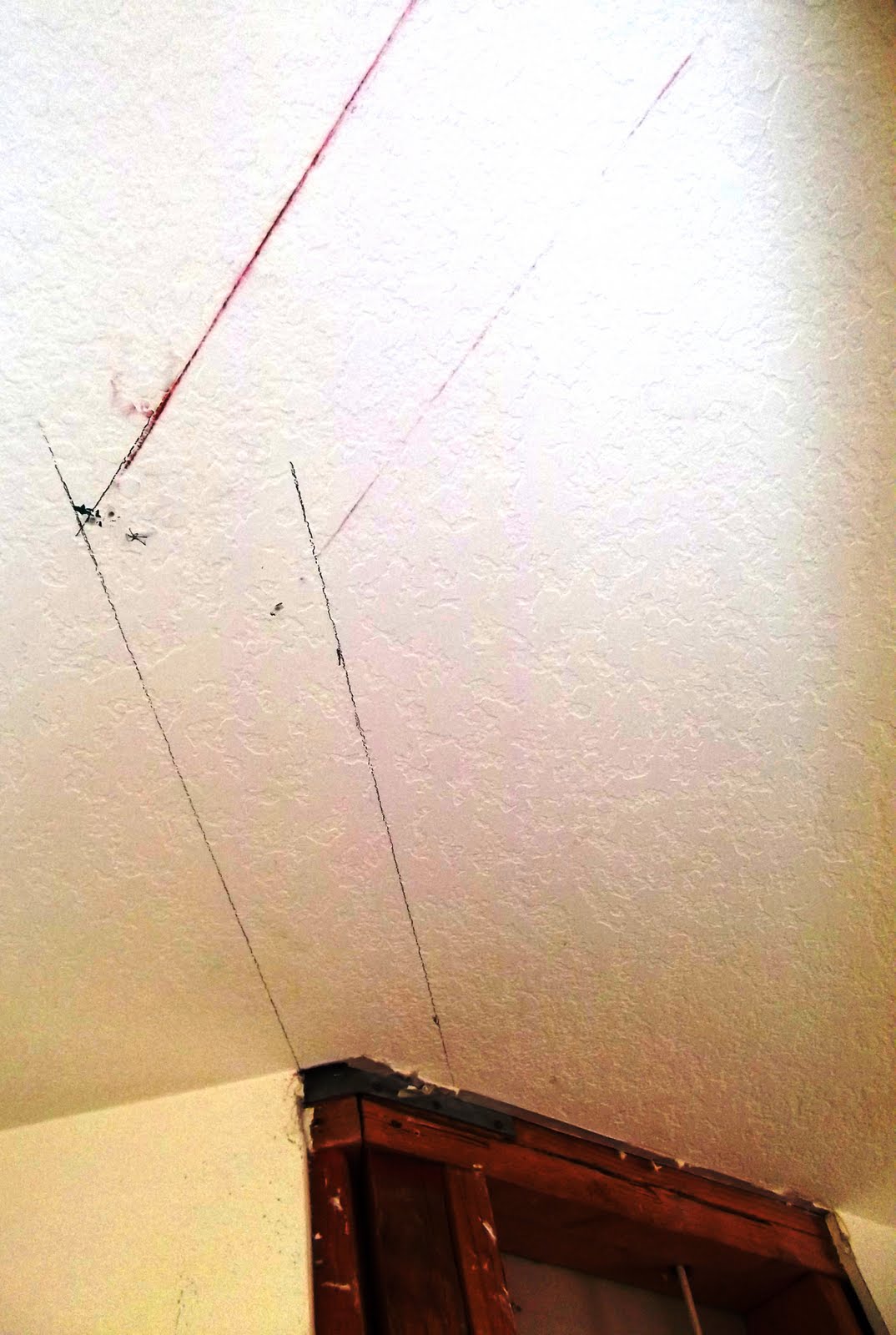 I began by nailing wall plates to the underside of the attic rafters. The red arrows indicate the direction of the crown of each stud. I want them all facing in the same direction, however slight they bow. |
